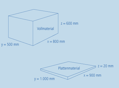 maximale Bauteilgrößen für Voll- und Plattenmaterial:
